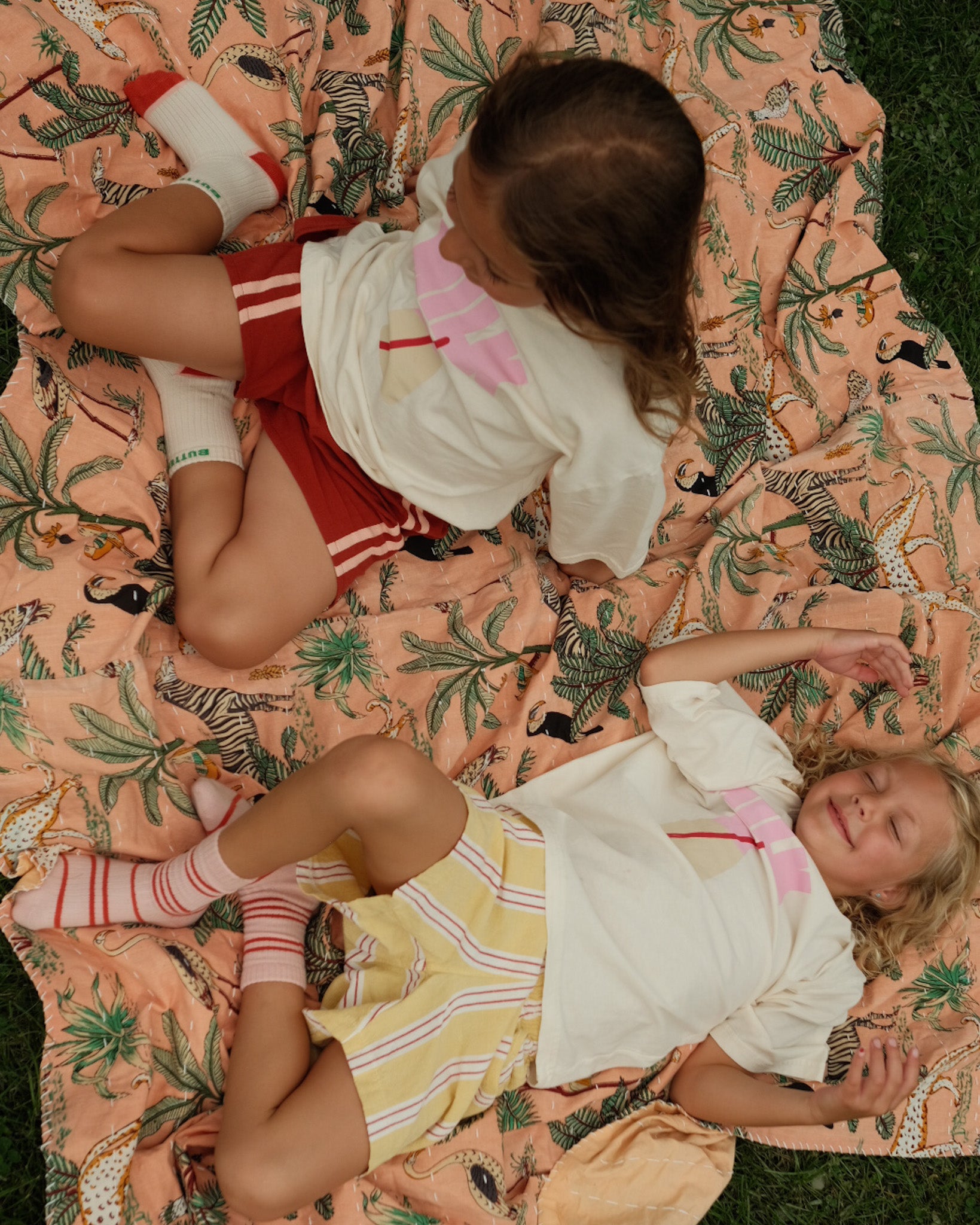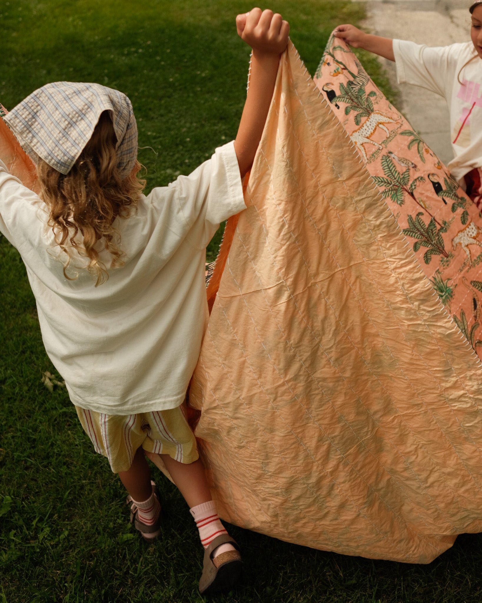 Bright color and lively jungle pattern come together on cotton fabric. Hand stitched together by woman in India in a jungle pattern using traditional kantha stitching with block printed patterns. Each throw is unique; the one-of-a-kind nature of the fabrics is what makes these throws special! Each throw is handmade with care by talented artisans.