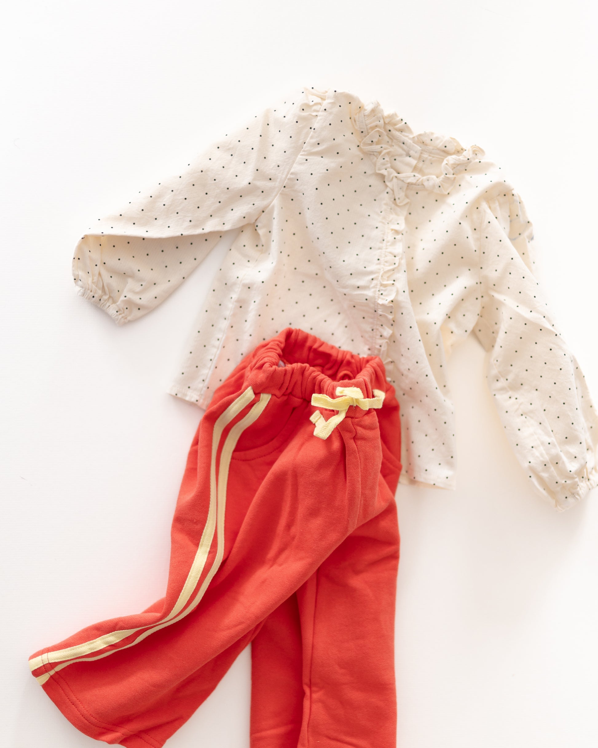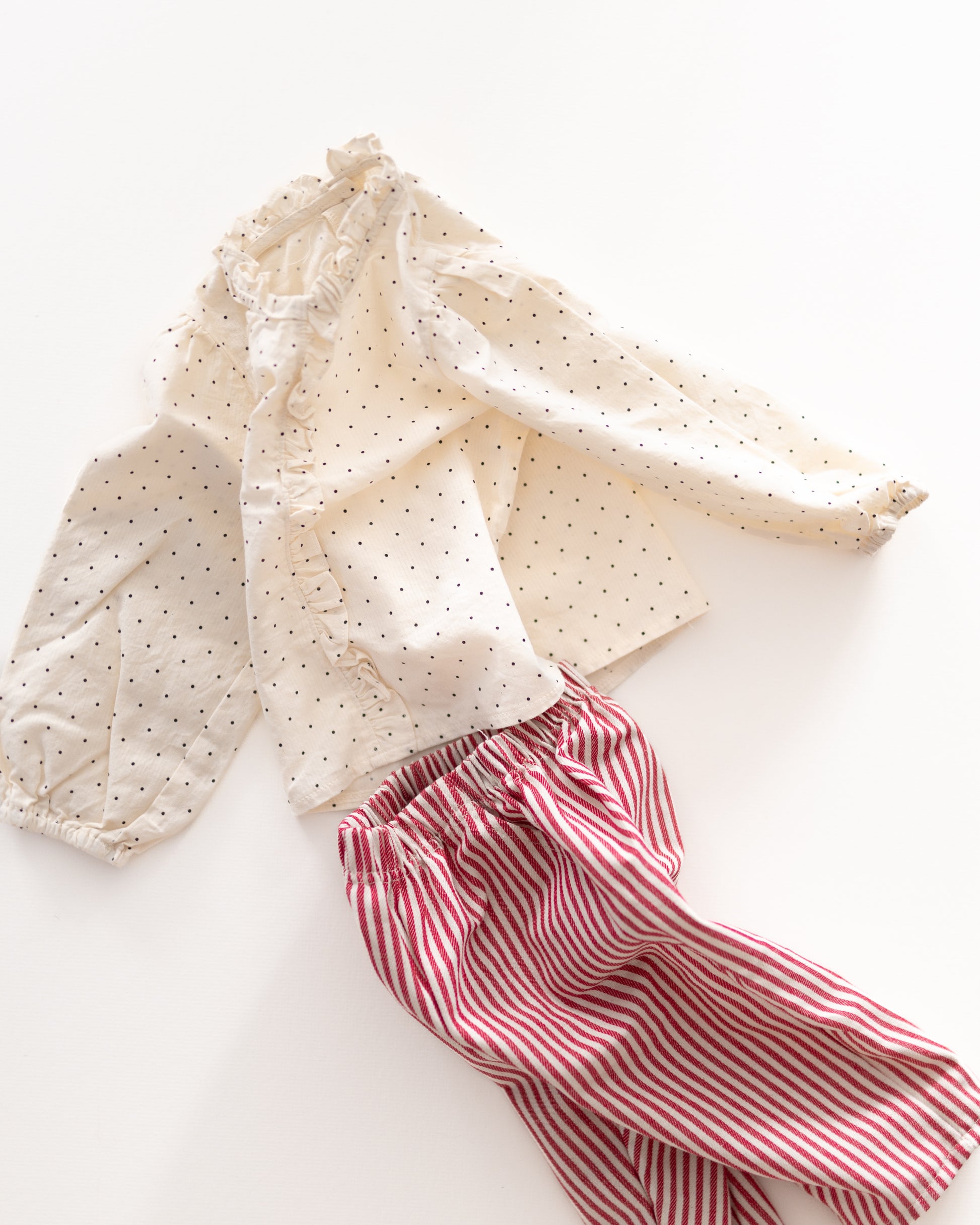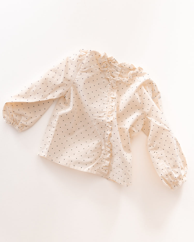 Whimsy polka dot blouse, with 2 buttons down the back for easy on and off. Elastic cuffs on the arms and a gorgeous ruffle around the neck.